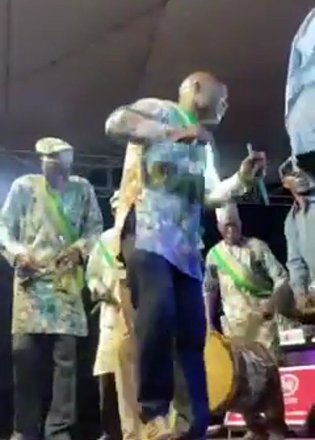 On a stage, multiple men are dancing to the beat of a drum that one man is playing on the floor in the center. Most of the men are wearing patterned tops, some with matching hats. Some of the men have green sashes on. They are dancing as a group, stepping side to side. There are lights above them. The background is blurry.