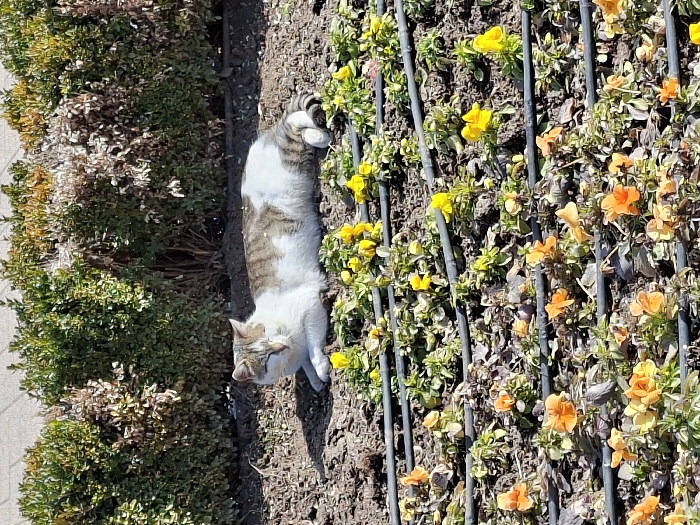 - "A domestic cat, exhibiting white fur with brown tabby markings on its back, head, and tail, is observed lying horizontally on dark brown soil" by FM-YQydj1, licensed under CC BY 4.0