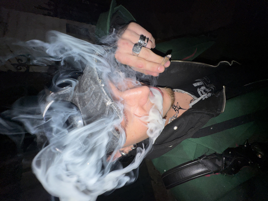 This image, captured in Asnières-sur-Seine, France, displays a close-up of an individual enveloped in a dense cloud of white smoke. The subject, presumably male, is depicted from the upper torso, with his head tilted slightly, exhaling or inhaling from a lit hand-rolled item held between the thumb and index finger of his right hand. His eyes appear closed or heavily lidded. The individual wears a dark green outer jacket over a partially unzipped black hooded garment, which covers a dark t-shirt with a graphic design. A gray, textured cap is worn backward, with dark sunglasses resting upon it. Visible accessories include multiple silver rings in the left ear, a nose ring, a silver chain necklace, and a black tribal-style tattoo on the throat. Several rings adorn the fingers of the right hand, specifically a large square-faced ring on the ring finger and stacked rings on the middle finger. A black leather strap, potentially from a bag or accessory, featuring metallic studs or spikes, is visible on the left shoulder area. The background is dark and out of focus, suggesting a nighttime or dimly lit environment. Faint, dark architectural elements, consistent with a decorative metal gate or fence, are discernable in the upper right quadrant.
