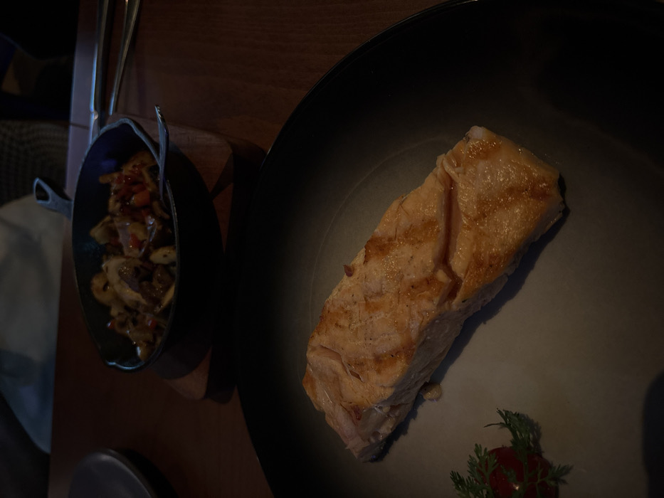 - "A close-up shot reveals a grilled salmon steak on a dark plate, accompanied by a small side dish in a skillet" by FM-mU2BK2, licensed under CC BY 4.0