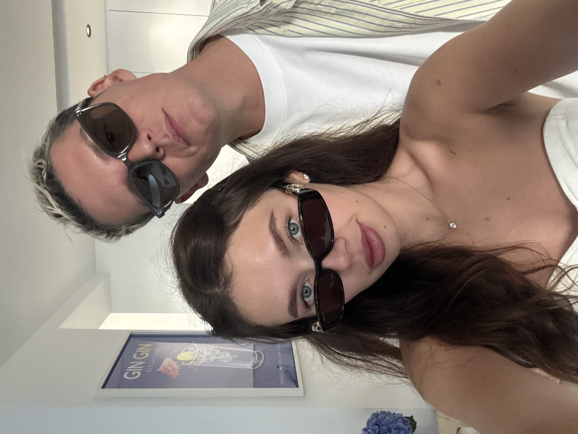 A selfie captures two individuals indoors. The person on the left has short blonde hair and is wearing sunglasses, a white T-shirt, and a striped shirt. The person on the right has long brown hair, sunglasses, a white top, and a necklace. On the wall is a framed poster with the words "GIN GIN SITUATION" on it. Below the poster is a blue hydrangea flower. The location is a building within the city of Livadia Larnakas, Cyprus.
