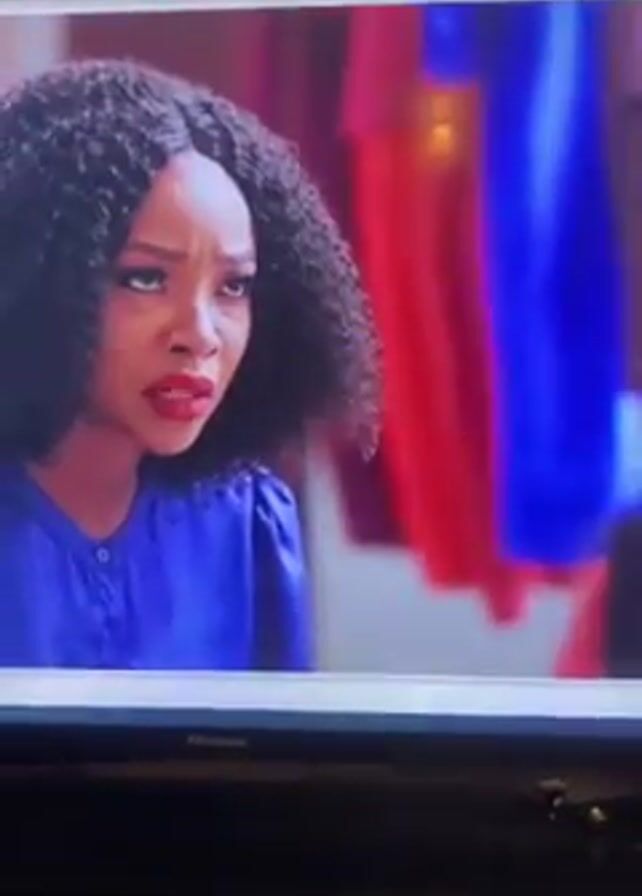 Here is a detailed description of the video: The video shows a scene playing on a Hisense TV. The first frame shows a woman with wavy, dark hair looking down at a smartphone in her hands. She is wearing a red dress with a silver brooch. The background includes clothing in various colors. The next shot shows a different woman, wearing a blue dress and with curly black hair. She looks concerned. The following shot shows both women sitting on a white couch. The woman in red is sitting with her legs crossed, gesturing with her right hand. The woman in blue is facing away from the camera. The final shot is a close-up of the woman in blue, and text appears on the right side of the screen, likely indicating production credits. In the lower left corner of the frame, below the TV, part of a black sound system and a small white pill bottle are visible.