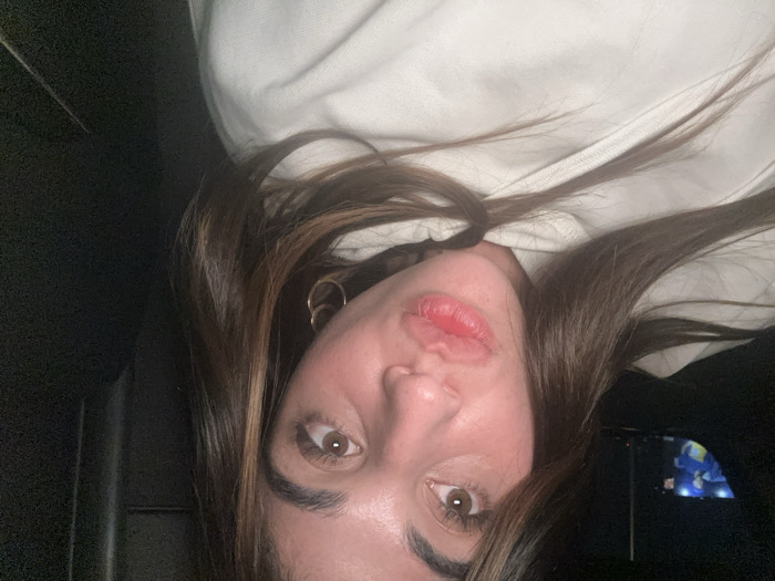 A woman with long brown hair, wearing a white hoodie and gold hoop earrings, is facing the camera. Her eyes are brown, and her lips are pink and slightly puckered. The background is dark, with a hint of a TV screen showing a cartoon in the bottom right corner. The perspective is tilted.