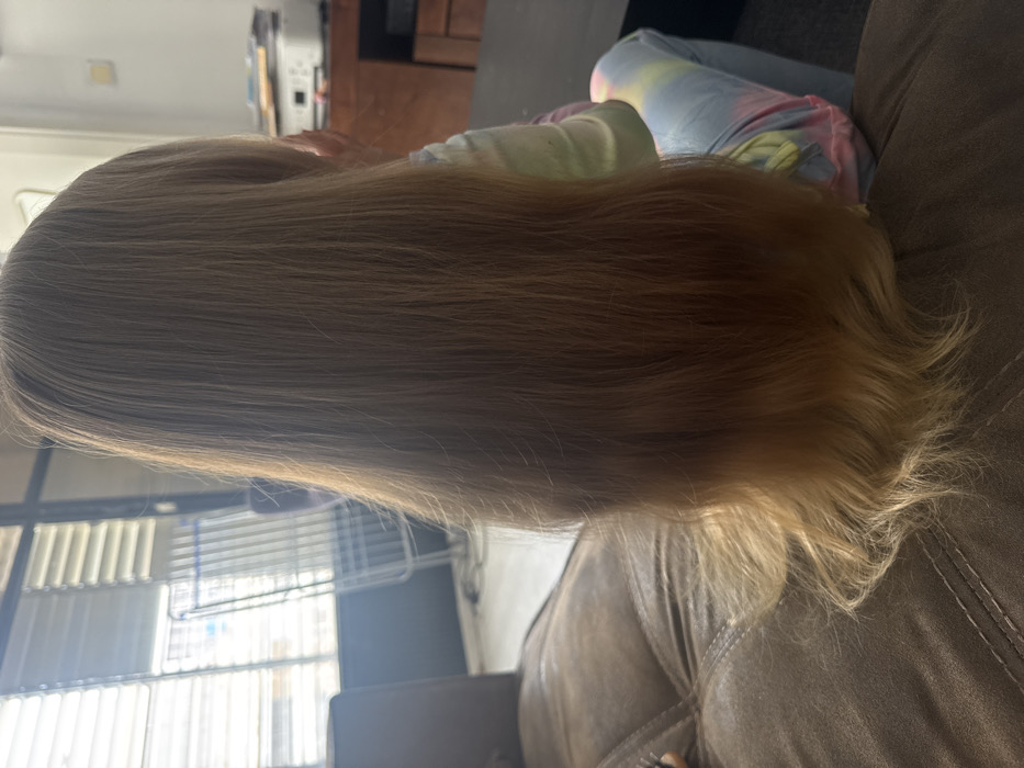 A young individual is depicted from behind, seated on a brown, tufted upholstered sofa. The individual has very long, straight, light brown hair with lighter, wavy ends, extending to their lower back. They are wearing multi-colored tie-dye patterned pants and a light-colored top. In the background to the left, a large window with horizontal blinds allows natural light into the room, revealing an outdoor clothes drying rack. To the right, a dark table or cabinet holds a white printer/scanner, with additional dark furniture visible below it. The room features light-colored walls. This scene is set within a residential interior in Bat Yam, Israel.