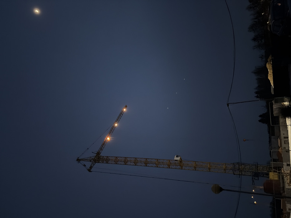 A nighttime scene features a yellow construction crane with illuminated lights on its arm. Above, a sliver of a moon is visible in the upper left. Faint, small lights are scattered in the dark blue sky above the crane. The background shows silhouetted trees and buildings with some lighting, along with a lamppost. The image is rotated 90 degrees counterclockwise.