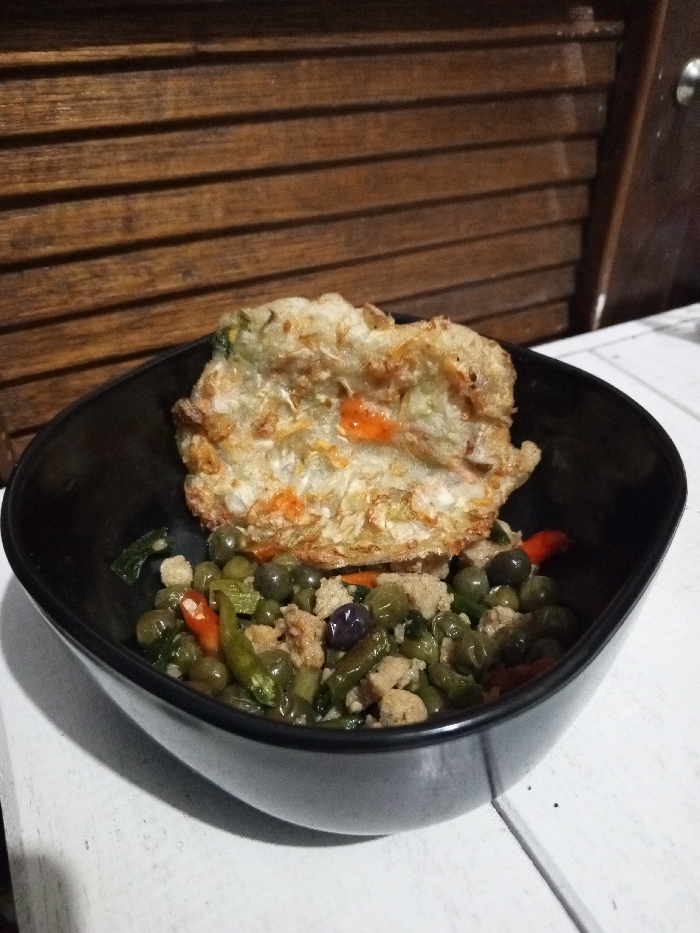The image displays a black, oblong-shaped bowl of food situated on a white, painted wooden surface. Within the bowl, a mixture of green peas, chopped green beans, small dark purple berries or vegetables, minced light brown protein, and sliced red and green chili peppers is visible. A single, irregularly shaped, golden-brown fried vegetable fritter, containing shredded vegetables such as cabbage and carrots, rests atop the mixture. The background consists of a horizontally slatted wooden wall with a medium brown finish. This scene is located in Bayawan, Philippines.