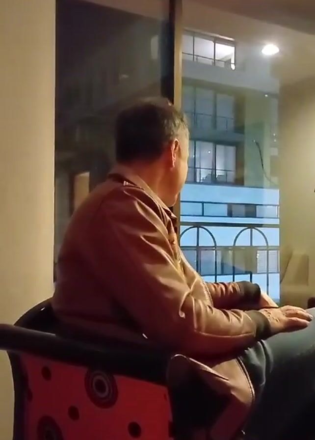 A man sits in a red and black patterned chair, wearing a brown leather jacket and blue jeans. He is facing a large window with a view of an apartment building outside. He turns his head towards the camera and waves his hand.
