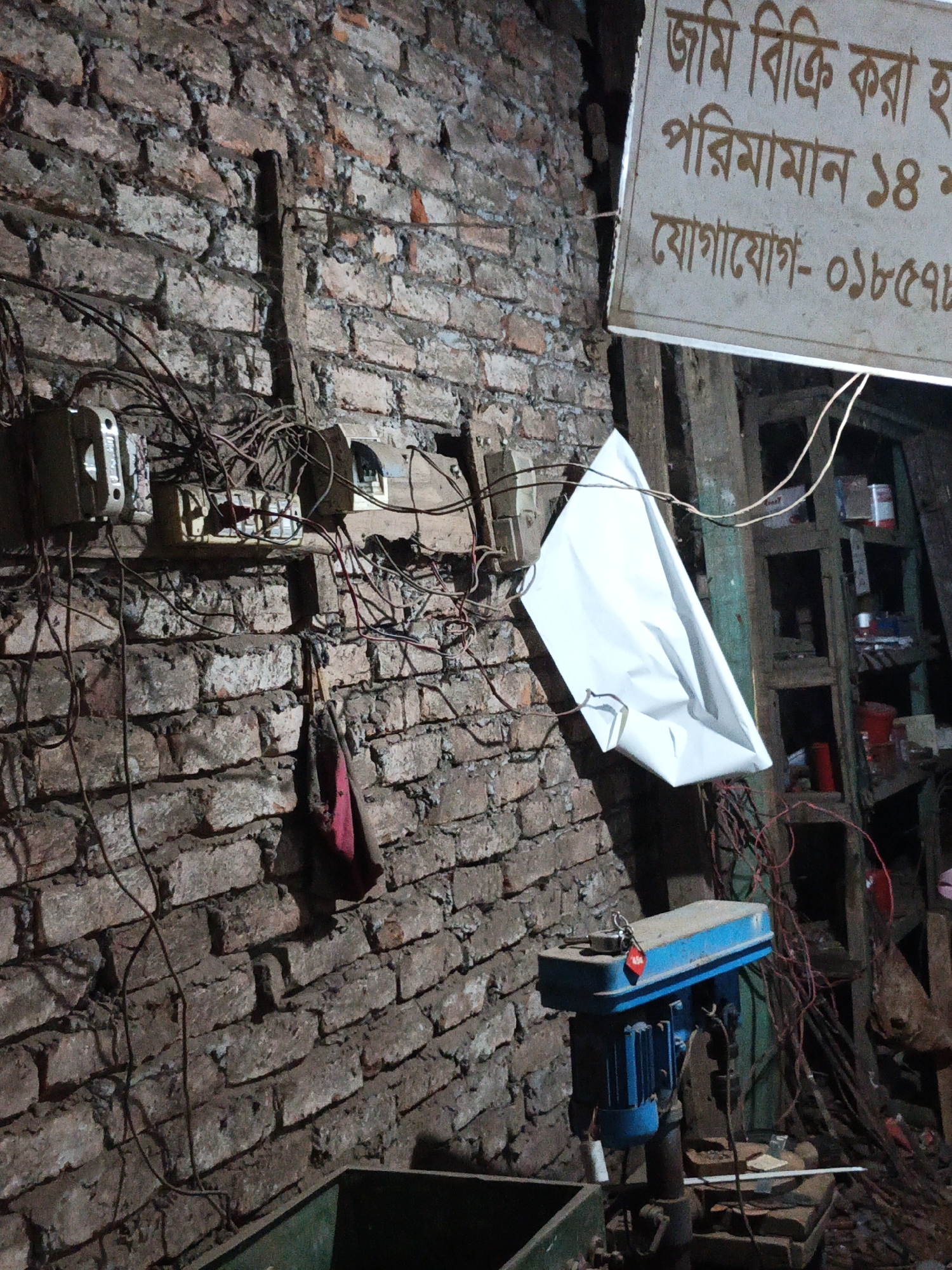 The image depicts a cluttered workshop in Kauria, Bangladesh. A worn brick wall serves as the backdrop, with exposed electrical wiring and outdated switches mounted on its surface. A sign written in Bengali, possibly advertising land for sale, hangs from a wooden frame. A blue drilling machine stands prominently in the foreground. The environment appears dimly lit and disorganized, suggesting a working space that is actively in use. No people are visible.