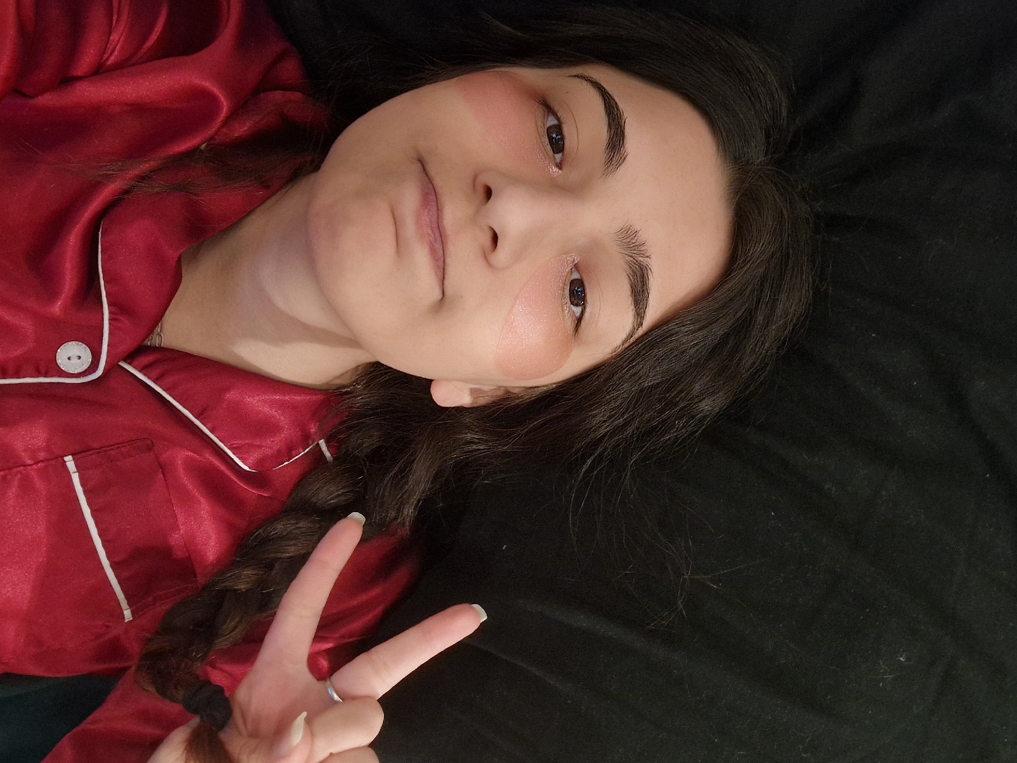 A young woman with dark hair is lying on a dark surface, possibly a bed or couch, and making a peace sign with her hand. She is wearing a red satin pajama top with white piping. She has some kind of facial mask on her cheeks. The background is plain and dark. The location is not discernible from the image; there is no indication that the image was taken in Leidersbach, Germany.