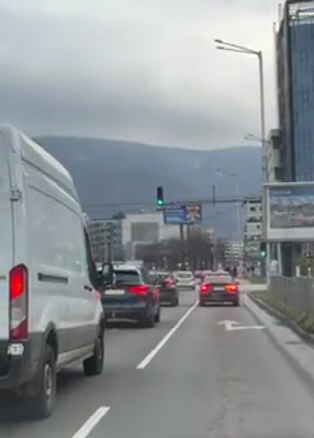traffic moving forward at a slow pace in a city setting