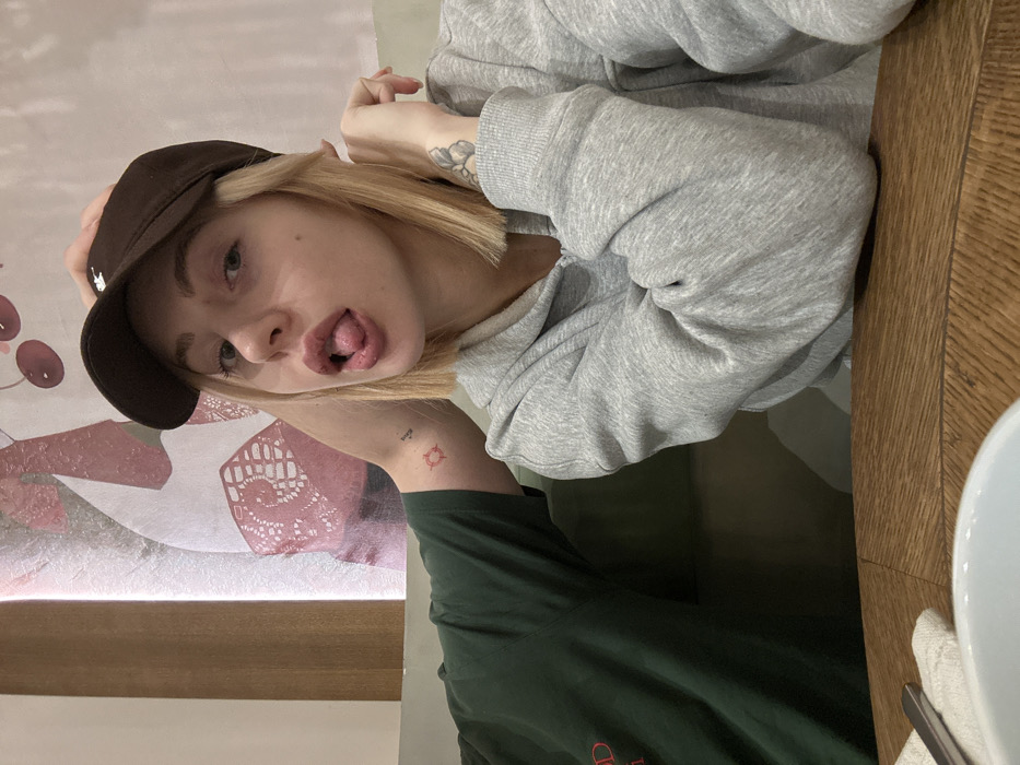 The image depicts an indoor scene, identified as being in Murino, Russia, within what appears to be a cafe or restaurant. The primary subject is a fair-skinned individual with short blonde hair, wearing a dark brown baseball cap and a light grey zippered hooded sweatshirt. This individual is positioned centrally, looking directly at the camera with their mouth slightly open and tongue extended. A light-colored, ornamental tattoo is visible on their left forearm. To the left of the primary subject, the right arm and shoulder of a second individual are partially visible. This individual is wearing a dark green short-sleeved t-shirt, and a small red, stylized geometric tattoo is present on their right forearm. The second individual's right hand is placed on the primary subject's head, beneath the baseball cap. Both individuals are seated at a light brown wooden table, where a portion of a white bowl and a metal utensil resting on a white napkin are visible in the lower left quadrant of the frame. The background features a light-colored wall with a large mural displaying abstract patterns and stylized red cherries. A green upholstered booth or bench is also visible behind the partially obscured individual.