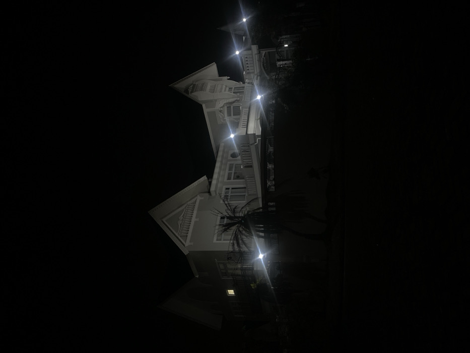 The image displays a multi-story residential structure, identified as located in Batulawang, Indonesia, at night. The house is predominantly light-colored, featuring a complex architectural design with multiple gabled roofs, ornate eaves, and several balconies or terraces adorned with white balustrades. Prominent white outdoor floodlights are affixed to the facade and perimeter of the building, generating significant lens flare. One interior window on the left side of the structure emits a warm, yellow light. A tall palm tree stands in the immediate foreground on the left, partially obscuring the lower section of the house. Dark foliage and a low wall are visible at the base of the property, separating it from the completely dark foreground, which suggests ground level or a roadway. The sky above is uniformly dark, indicating nighttime conditions. No individuals are visible in the scene, and no specific actions or interactions are depicted.