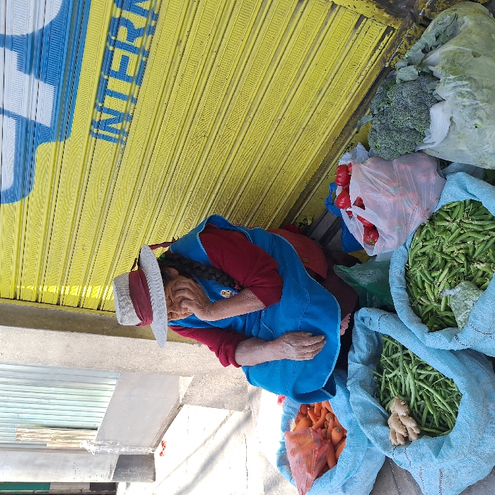 An elderly woman wearing a traditional red shirt, blue vest, and straw hat sits beside several bags of produce. One bag contains carrots, while others are filled with green beans and peas. Broccoli and tomatoes in a plastic bag are also displayed. The market stall sits in front of a closed yellow shutter door with blue lettering.