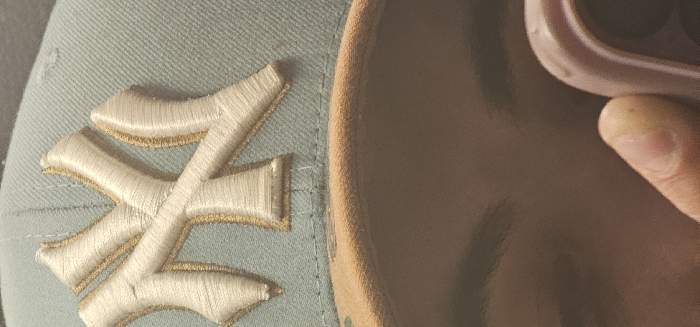 A close-up shot presents a baseball cap adorned with a white "NY" logo outlined in gold. The cap is light blue. A portion of a face, including part of the cheek and a hand holding a phone, are visible on the right side of the frame. The background is blurred, keeping the focus on the cap and logo.