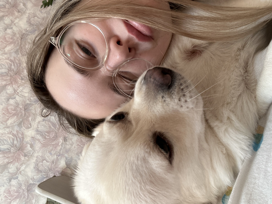 A close-up image captures a female individual and a dog in an intimate, resting pose within an interior setting in the city of Азинский, Russia