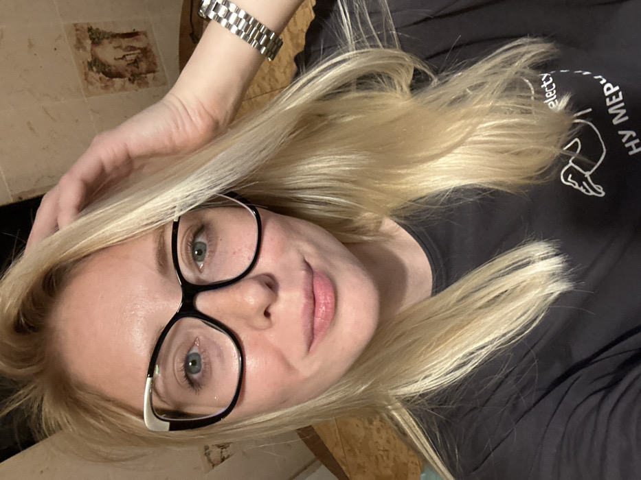 A blonde-haired female individual is depicted in a close-up portrait, oriented forward, with light-colored eyes and a slight, closed-mouth smile. She wears black eyeglasses with white accents on the upper outer corners of the frames. Her left hand is raised to the right side of her head, with fingers partially obscured by her hair, appearing to adjust or rest in her hair. A silver-toned metal watch with a link bracelet is present on her left wrist. She is wearing a dark-colored, short-sleeved t-shirt with white lettering and a graphic design on the chest, including partial visibility of the word "selecty" and Cyrillic script. The background reveals an interior space with a wall featuring textured or tiled surfaces in warm, earthy tones. A small decorative tile or picture, depicting a scene with foliage and what appears to be bottles or figures, is visible on the upper right portion of the background wall. No specific architectural features or landmarks are discernible to forensically confirm the location as being in the city of Voskresensk, Russia.