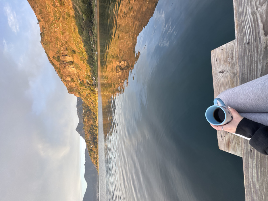 From a wooden dock in San Pablo La Laguna, Guatemala, a first-person view captures Lake Atitlán and surrounding mountains during golden hour. The lower body of an individual is visible, wearing light gray trousers. A left hand, adorned with a silver ring and light-colored nail polish, holds a light blue ceramic mug with dark patterns, filled with a dark liquid. The calm lake water reflects the warm, golden sunlight illuminating the rugged, vegetated slopes of the distant mountains and scattered shoreline structures. The sky exhibits partial cloud cover.