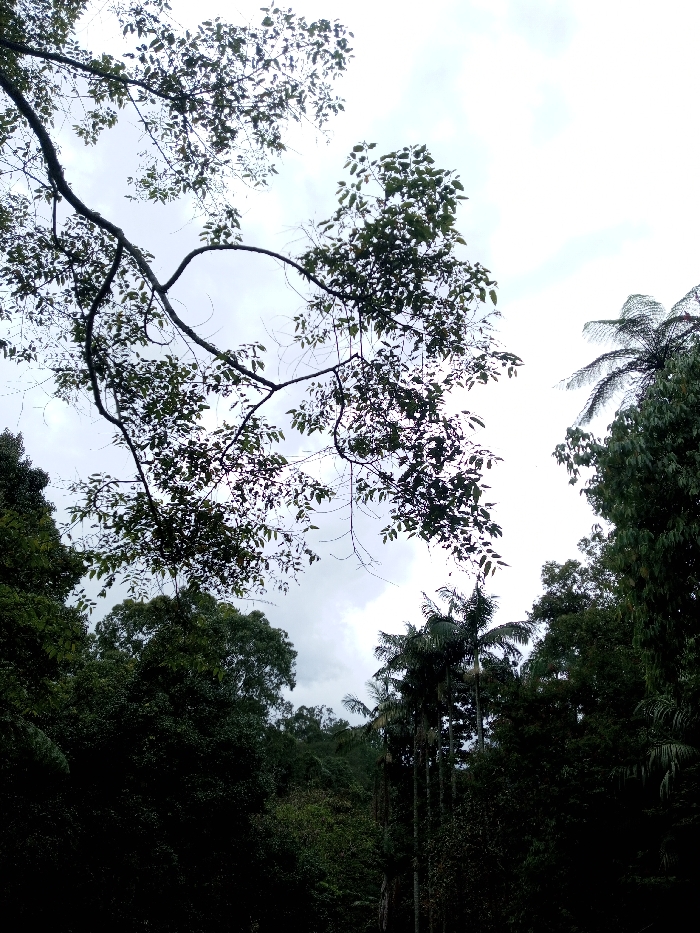 Lush greenery fills the frame, with a variety of trees dominating the scene. The sky, a muted gray, peeks through the dense foliage. A prominent branch stretches across the upper left, its leaves partially obscuring the sky. Palm trees stand tall amidst the other trees, adding to the tropical ambiance. The light is subdued, enhancing the depth and textures within the forest.