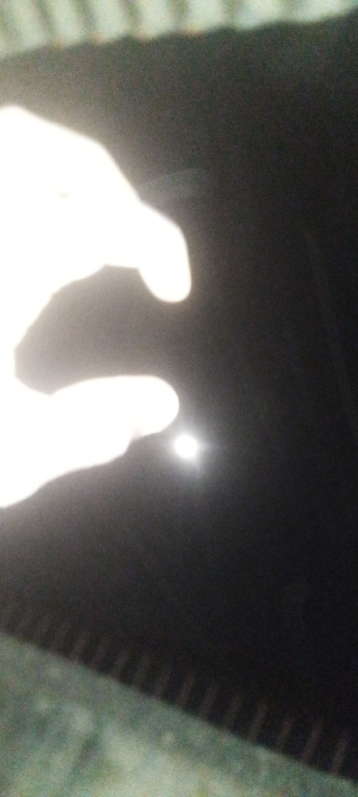 In a dimly lit scene, a pale hand, seemingly illuminated from an unseen source, partially obscures a small, intensely bright point of light