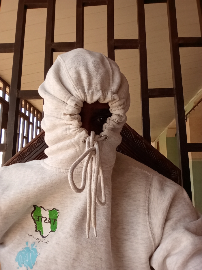 A frontal portrait image depicts an individual in Barakin Akawo, Nigeria, wearing a light gray hooded sweatshirt. The hood is tightly cinched, revealing only the dark eyes and the upper bridge of the nose. The sweatshirt's light-colored drawstrings are visible, tied in a knot at the front. On the left chest area, a graphic features a green and white stylized map of Nigeria with the vertical text 'TASTE', accompanied by an abstract blue design below it. The background consists of dark brown vertical and horizontal bars, indicative of a window grille or security barrier. A light-colored ceiling is visible above the bars, and a segment of a light green wall is present to the right of the subject.
