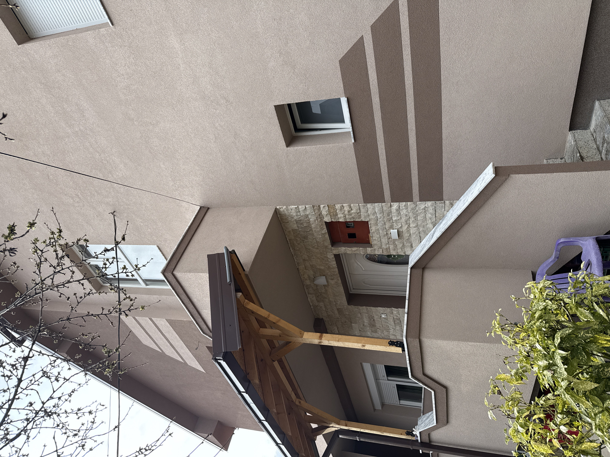 A detailed forensic description of a residential exterior in Kumanovo, North Macedonia, captured during daylight hours. The scene depicts the facade of a two-story building featuring a textured, light beige stucco finish. The upper section includes dark brown eaves. On the upper right, a rectangular window is equipped with a partially raised white exterior roller shutter. Below this, a smaller, recessed rectangular window with white trim is positioned above two horizontal, dark brown decorative stripes on the wall, which terminate in angled shapes. The main entrance is covered by a wooden canopy, supported by two light-colored wooden posts with dark metal bases, and topped with a dark brown metal roof and gutter system. The wall surrounding the entrance is faced with light-colored stone veneer. A white entrance door with an oval glass insert is visible. To the immediate right of the door, a small, rectangular red box (likely a mailbox or utility access) is affixed to the stone veneer. An outdoor staircase, constructed with a beige stucco base and capped with white marble-like accents, ascends to the main entrance. Below the main staircase, on the right, a separate set of grey, granular steps descends towards a lower ground level. A window with a fully lowered white exterior roller shutter is located on the lower left portion of the building. In the lower foreground, a green and yellow variegated shrub is prominently featured, partially obscuring a purple plastic outdoor chair positioned against the building wall. Bare tree branches with visible green buds extend into the upper left and central portions of the image, indicating early spring. A dark utility cable traverses the upper left section of the frame. No individuals are present in the scene.