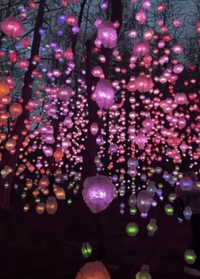 darkened forest filled with numerous illuminated, variously colored, spherical or amorphous glowing objects hanging from the trees. The lights are primarily pink, purple, and orange, with some green and blue accents. In the foreground, some figures are visible among the trees, appearing to be interacting with the light installation. The overall atmosphere is magical and ethereal, highlighting the contrast between the natural forest setting and the artificial, colorful lighting.