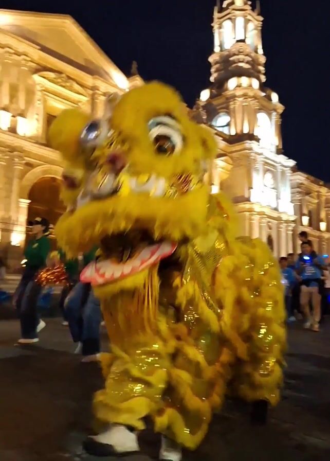 person in a yellow Chinese lion costume in the evening