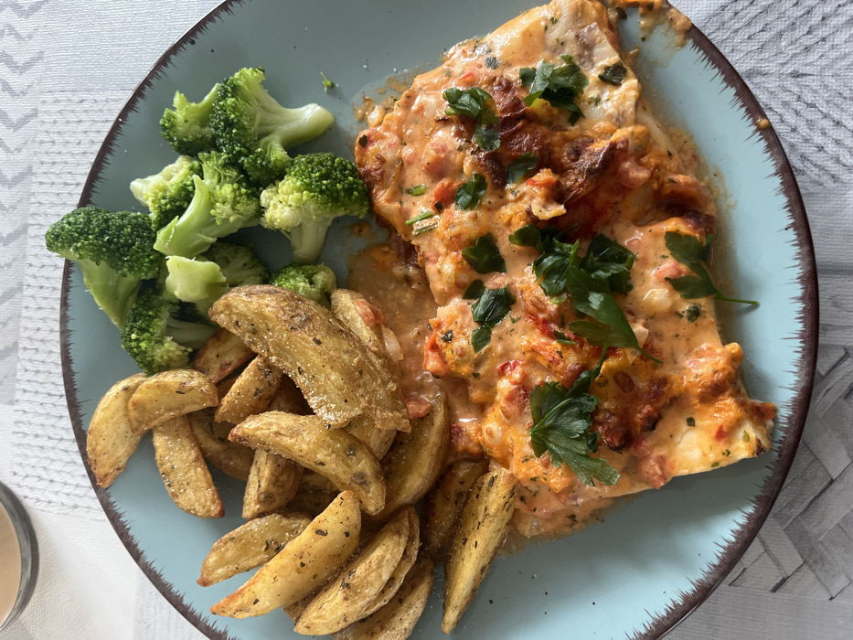 The image displays a close-up, overhead view of a prepared meal served on a round, teal-colored plate with a brown speckled rim. The plate rests on a light-colored tablecloth featuring a subtle, geometric zigzag pattern. The meal consists of three distinct components. In the upper left quadrant, a pile of golden-brown potato wedges, appearing oven-baked, is seasoned with visible specks of black pepper and herbs. In the upper right quadrant, a cluster of steamed green broccoli florets is arranged. The lower half of the plate contains a main dish, likely a fillet of fish or poultry, generously covered in a creamy, reddish-orange sauce. This sauce contains visible diced red elements, possibly bell peppers or tomatoes, and is garnished with fresh green parsley leaves. A clear glass containing a light brown beverage is partially visible and out of focus in the top left background. No specific people are depicted. The objects are a meal on a plate, a tablecloth, and a partial glass. No actions or interactions are occurring; the scene is static. The environment is an indoor dining setting. The image provides no visual information to determine a specific location within the city of Garmisch-Partenkirchen, Germany.