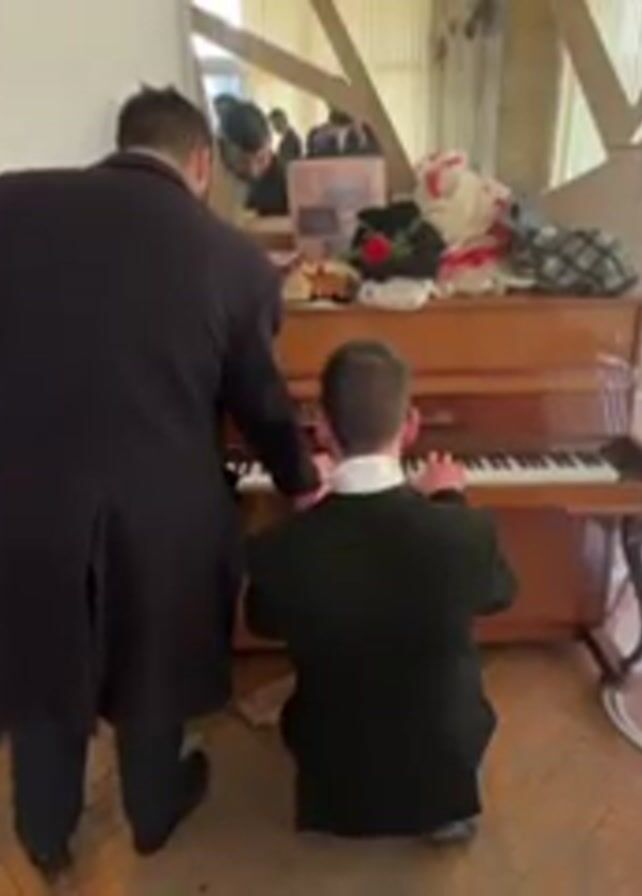Two men are in a room playing a piano. The man kneeling is wearing a black jacket, white shirt, and black pants. The other man stands behind the pianist, also in a black jacket, guiding the pianist's hands on the keys. The piano is a light wood color with items piled on top. A large paper flower is to the right of the piano, next to a window. A speaker and desk with equipment are on the left. The floor is wooden planks. A mirror on the wall behind the piano reflects other people in the room.