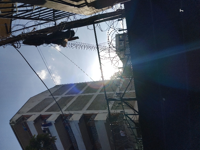 The scene depicts an outdoor urban environment in Nkaimurunya ward, Kenya, observed from a low angle. A light-colored, multi-story apartment building, approximately five floors high, occupies the left side of the frame, featuring balconies on each level where clothing is visible hanging. The building facade combines light-toned plaster with darker rectangular panels. A dark, solid wall or fence spans the immediate foreground, topped by a metal fence section adorned with coiled razor wire extending across the mid-ground. To the right, a utility pole supports numerous overhead electrical wires, from which dark clothing articles are suspended. The sun is positioned low in the sky, causing significant lens flare and backlighting, casting the lower half of the image into shadow. The sky is predominantly clear blue with scattered white clouds. No individuals are visible.