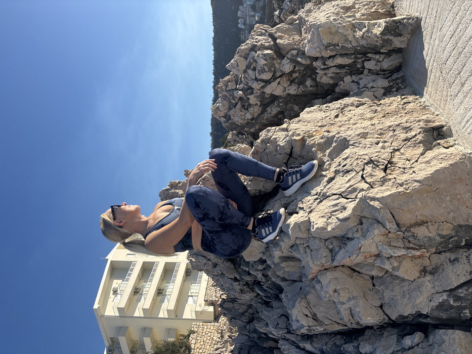 A blonde individual with hair in a ponytail and wearing dark sunglasses is depicted in a squatting position atop a large, light-colored rock formation. They are dressed in a matching dark blue or indigo athletic top and leggings, featuring a subtle pattern, and dark blue athletic shoes with white soles. Their arms rest on their thighs, and their gaze is directed towards the right side of the frame, under a clear, bright blue sky. The scene is set on a rocky coastline in the city of Bar, Montenegro. To the left, a light-colored, multi-story building with balconies and external air conditioning units is visible on elevated terrain. To the right, a distant forested hillside with scattered white structures can be seen. A paved walkway is partially visible at the bottom right. The area is illuminated by bright sunlight, casting shadows and emphasizing the jagged textures of the rocks.