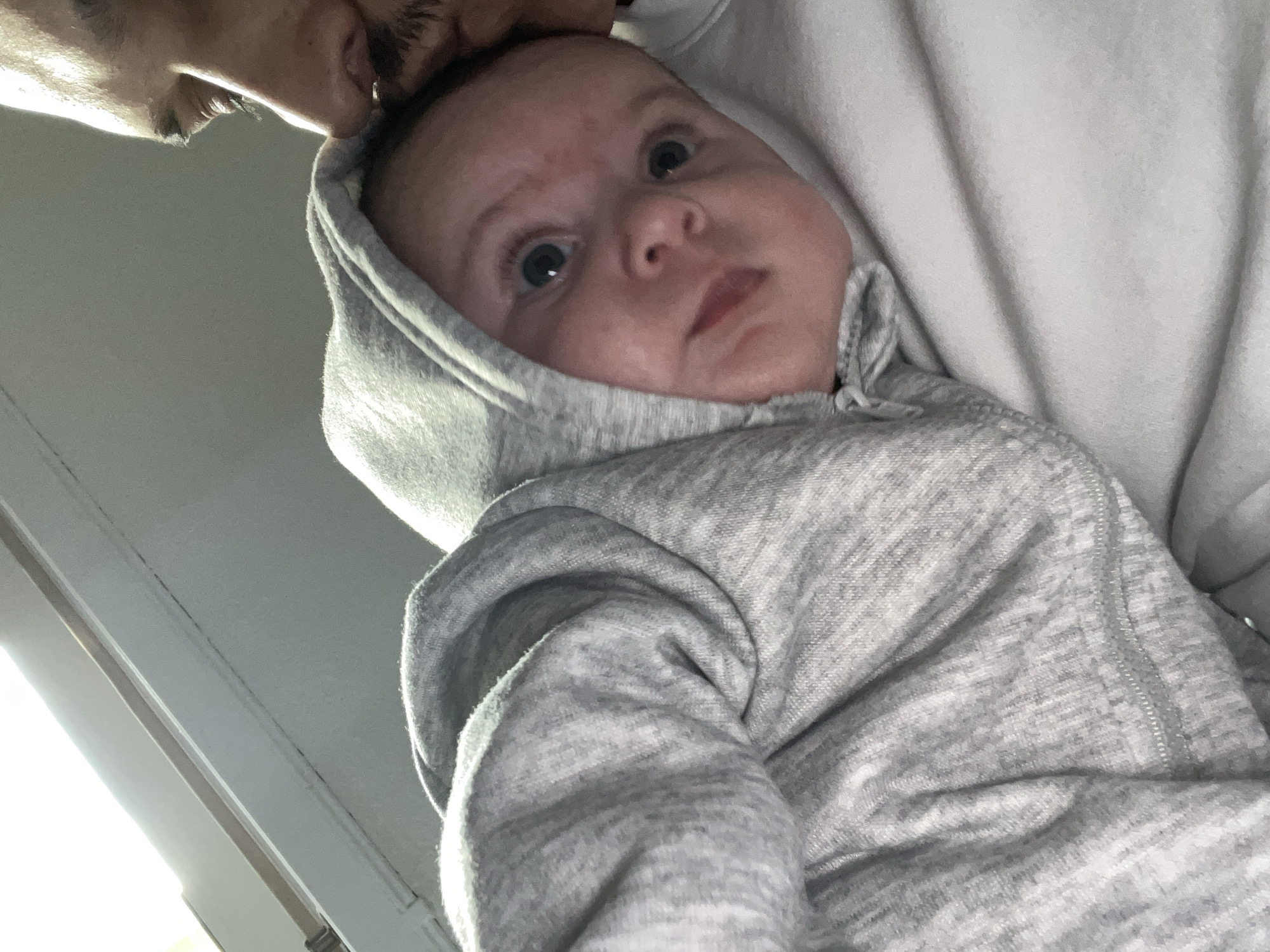 The scene is located in Frankfurt, Germany. An adult and an infant are depicted in a close-up, eye-level indoor setting. The adult, positioned in the upper right quadrant, shows the right side of their face, including a brow, eye, nose, and upper lip, with visible short facial hair. The adult's head is tilted downward, indicating focus on the infant. A white garment is partially visible on the adult's right side. The infant, centrally positioned, is dressed in a light grey, heathered hooded garment, with the hood up around its face. The infant's face is light-skinned, with wide-open blue eyes looking towards the camera. Its small mouth is slightly ajar. The infant is held close to the adult, likely resting on the adult's chest or shoulder. The background is a bright, unfocused light-colored interior surface, possibly a wall or ceiling, with a visible horizontal line suggesting an architectural feature such as a door or window frame, and a strong light source originating from the upper left.