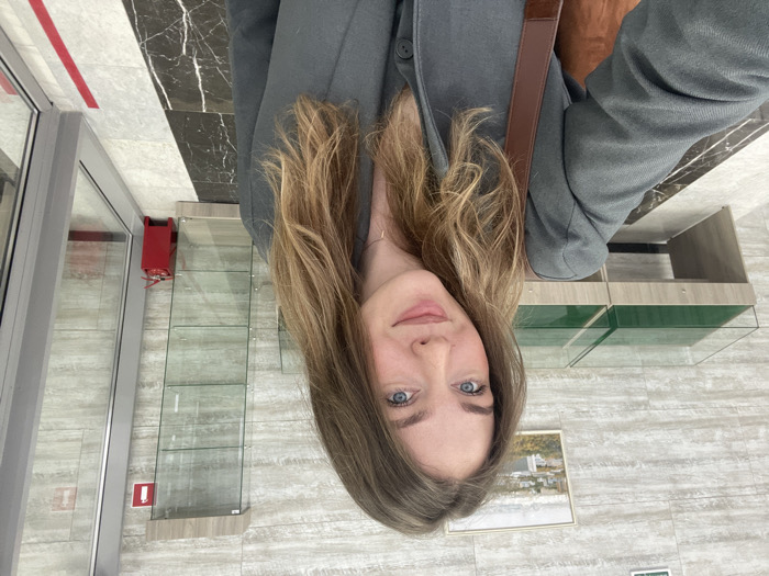 A young adult female, with light complexion, long wavy light-brown hair, blue eyes, and a faint smile, faces the camera. She wears a dark grey blazer over a dark grey button-up top and a thin necklace, with a brown strap visible over her right shoulder. The scene is an interior of a modern building located in Moscow, Russia. The walls are tiled with light-colored, horizontally striated panels. The floor is composed of two distinct sections of polished marble-patterned tiles: dark grey/black on the left and lighter grey/white on the right, separated by a straight line. A red tape line is present on the lighter floor section near a glass door on the far right. On the left side of the frame, two identical, empty, rectangular display cases with light-colored wooden bases and dark green interior bottoms are positioned. In the background, between the display cases, a framed picture depicts an aerial city landscape. Towards the right, a tall, narrow, empty glass display cabinet with light-colored wooden top and bottom panels stands. Below this cabinet, a red fire extinguisher on a red stand is visible, with a red wall-mounted sign featuring a white fire extinguisher icon and an upward arrow above it. A small green sign is partially visible on the upper left wall. The subject is taking a photograph, and no other individuals or interactions are visible.