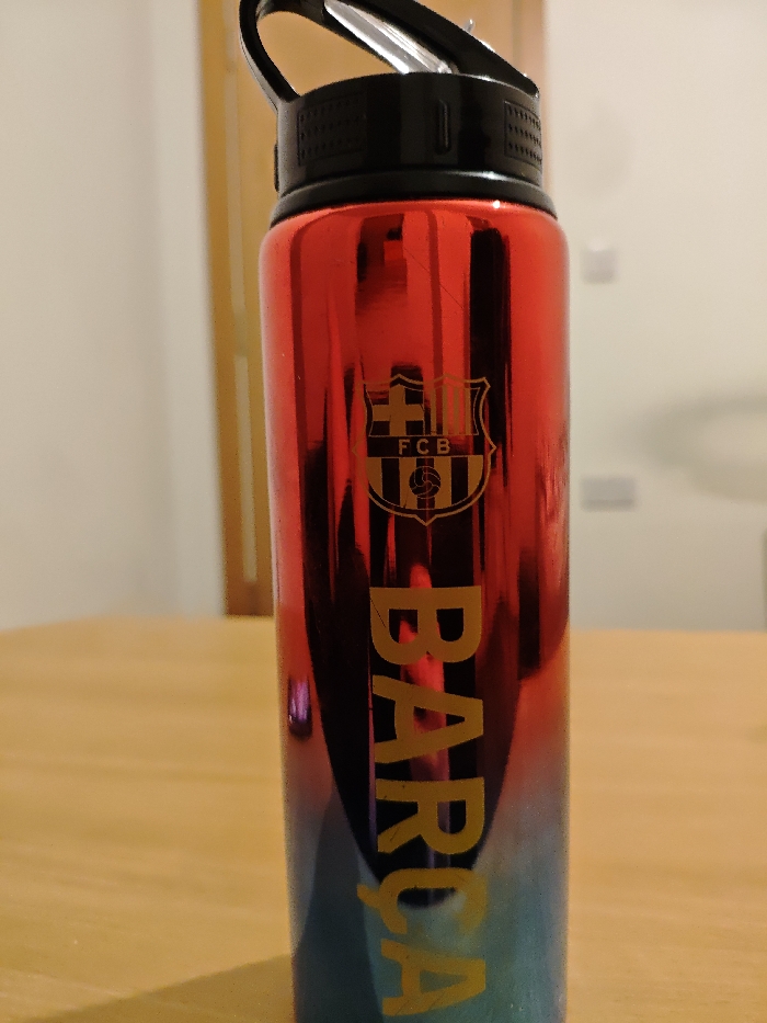 A close-up, eye-level shot depicts a reflective metal water bottle standing upright on a light brown wooden surface. The bottle features an ombre design, transitioning from glossy red at the top to a dark blue/teal at the bottom. The FC Barcelona (FCB) crest is visible in gold near the top of the bottle, with the word "BARÇA" printed vertically in matching gold lettering below it. The bottle has a black plastic lid with a clear flip-up straw/spout mechanism and a black carrying loop. Minor vertical scuff marks are present on the bottle's reflective surface. The background consists of a light-colored wall, with a partial light brown wooden door frame visible on the left and two white light switches mounted on the wall to the right. The scene is illuminated by an indoor light source, reflecting prominently on the bottle. No individuals, actions, or interactions are visible. The precise location within Swindon, United Kingdom, cannot be determined from the visual information provided.
