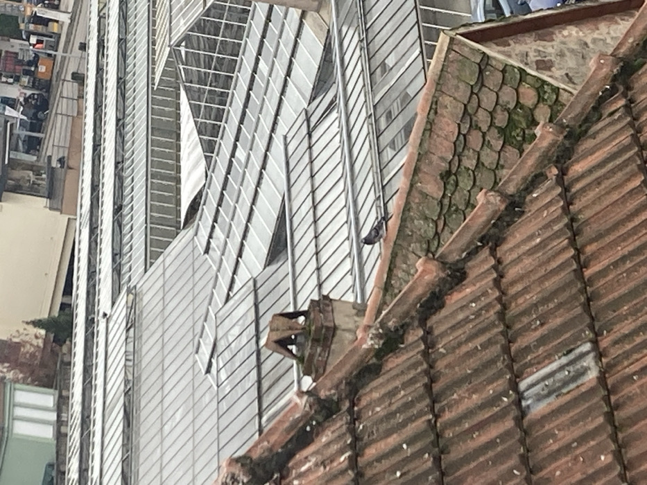 The scene, located in Saverne, France, depicts an elevated view over urban rooftops under overcast conditions. In the immediate foreground, a weathered reddish-brown tiled roof, partially covered in moss and white detritus, angles down from left to right. A brick chimney, topped with a distinctive dark, M-shaped metal cap, rises from this roof. To the right of the chimney, a single grey pigeon is perched on a roof ridge composed of smaller, rounder, moss-covered tiles. Beyond this foreground roof, an extensive complex of interconnected glass-roofed structures dominates the midground. These structures exhibit a regular pattern of clear panels and visible metal framing, reflecting the dull light of the sky. In the background, sections of light-colored building facades are discernible, along with a slender coniferous tree. Further to the right in the background, multiple vehicles are parked on a paved area, suggesting a street or parking lot. No human subjects or discernible human activity are present.