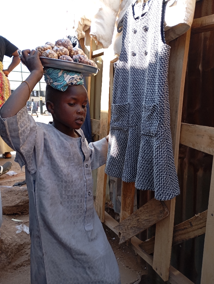 An outdoor scene in a market area of Jos, Nigeria, is depicted. The foreground features a young child, approximately 5-8 years old, wearing a light gray, long-sleeved tunic with a subtle patterned texture. The child carries a round, silver-colored metal tray balanced on their head, cushioned by a light blue and white patterned fabric. The tray contains numerous small, individually wrapped items in clear plastic, possibly food products. The child's left hand is raised, fingers spread, lightly touching the tray's edge. Their gaze is directed downwards and to the right, with their mouth slightly ajar, and a visible tear or moisture beneath the right eye. To the child's right, a sleeveless dress with a dark blue and white speckled or tweed-like pattern, featuring four dark buttons and two pockets, hangs from a makeshift wooden structure. This structure is composed of rough-hewn wooden planks and beams, suggesting a stall or display. Overhanging above the dress is a piece of light-colored fabric or material. The ground beneath is uneven, composed of reddish-brown earth or dust, with some debris visible. In the blurred background to the left, parts of another individual, including an arm and leg, are discernible, along with distant, indistinct figures walking, indicating a busy public space. Strong sunlight illuminates the scene from the right, creating defined shadows.