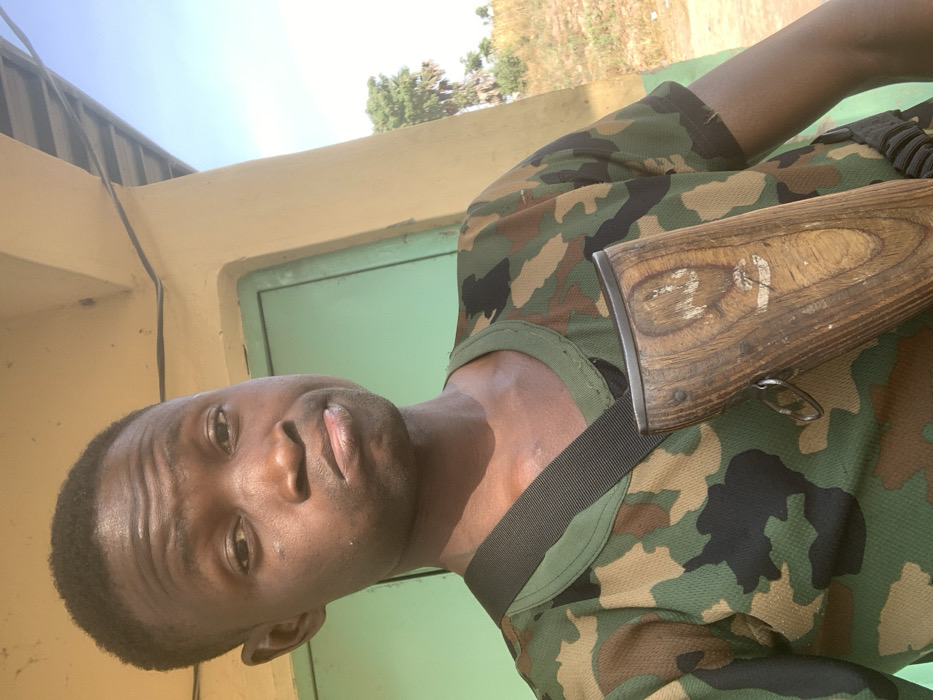 A man in a camouflage uniform poses for a close-up shot, a wooden rifle slung over his shoulder. His dark complexion is prominent, and he faces the camera with a direct gaze. The background shows a building's exterior, with a combination of light yellow and green hues, along with a distant view of trees. The lighting highlights the man's features and the details of his attire and rifle.