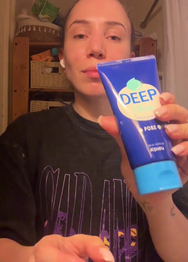A woman is holding a tube of deep clean pore cleanser in front of a bathroom mirror. The tube is blue and has white lettering, and a blue lid. She opens the lid and dispenses some of the cleanser onto her palm. The water is running in the background. The woman is wearing a black T-shirt with purple and yellow graphics, white wireless earbuds, and several rings. Behind her is a wooden shelf with various items on it, and a white shower curtain is visible on the right side of the frame.