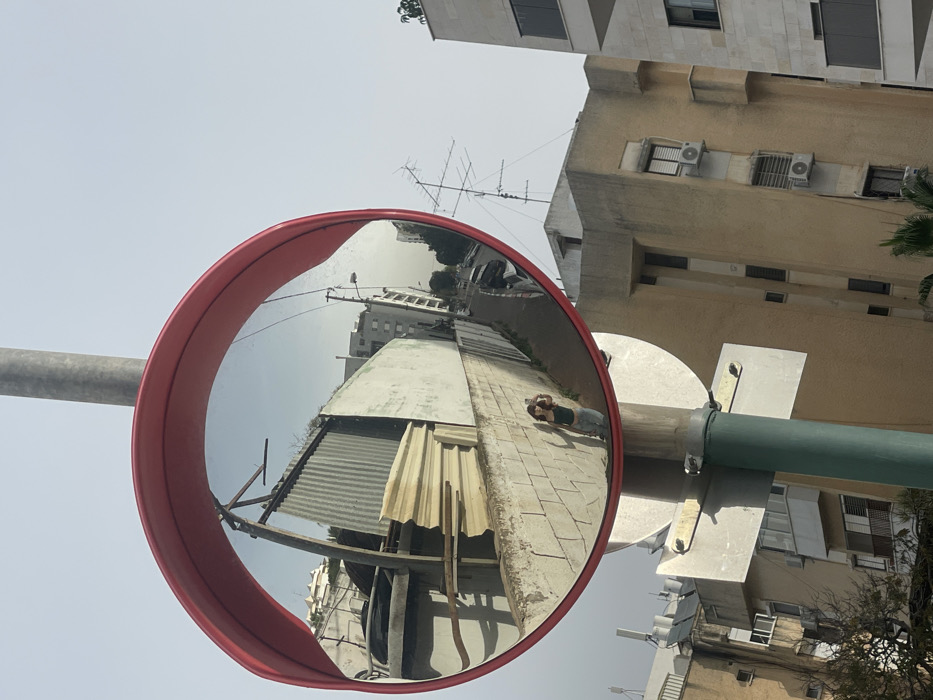 - "A convex mirror with a red frame reflects a street scene with corrugated metal structures and a sidewalk where a person lies down" by FM-AyUtz1, licensed under CC BY 4.0