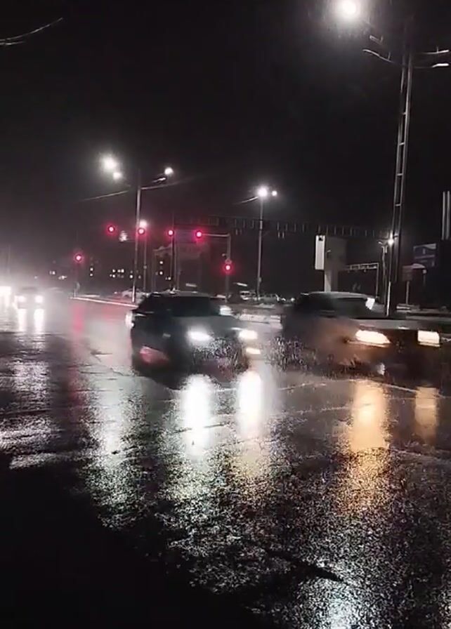 The video captures a nighttime scene on a wet city street