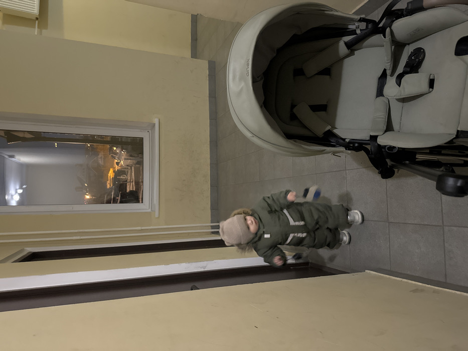 The image depicts an indoor hallway or common area within a building in Akulovo (Gp Kubinka), Russia, at night. A young child, dressed in an olive-green padded snowsuit with a fur-trimmed hood, a light beige knitted hat, and silver shoes, walks from left to right across a grey tiled floor. The child holds a small blue and white object in their right hand. To the right of the child, an unoccupied beige "anex" brand baby stroller is positioned, facing away from the viewer. The walls are painted a light yellow-beige, exhibiting some discoloration near the floor. A dark brown door with light trim is visible on the left. A white-framed window in the mid-ground reveals an exterior night scene: streetlights illuminate a snowy or frosty ground with multiple parked vehicles, including a light-colored sedan partially visible through the window. White vertical pipes run along the wall to the left of the window.