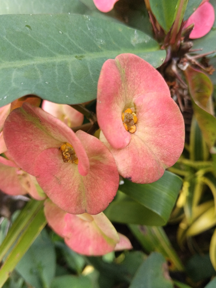 - "Two vibrant pink Crown of Thorns flowers take center stage, their curved bracts showcasing a yellow center" by FM-Lsgk03, licensed under CC BY 4.0