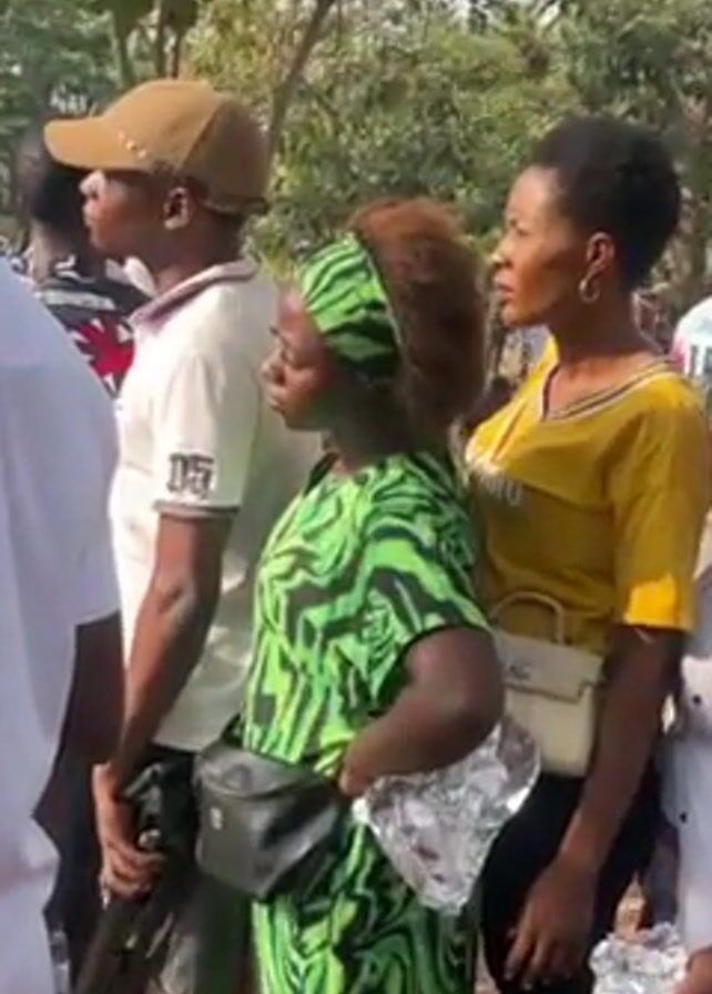 The video depicts a crowded outdoor scene, seemingly a gathering of people in a park or similar green space. The camera focuses on several individuals within the crowd. Most of the people are dressed in casual attire, and there are a variety of skin tones and hair styles visible. Some individuals are wearing face masks. The background consists of trees and other greenery. The lighting suggests it is daytime. There is no distinct action besides the presence of people standing or moving within the crowd. It is not possible to tell the nature of the gathering based on the video.