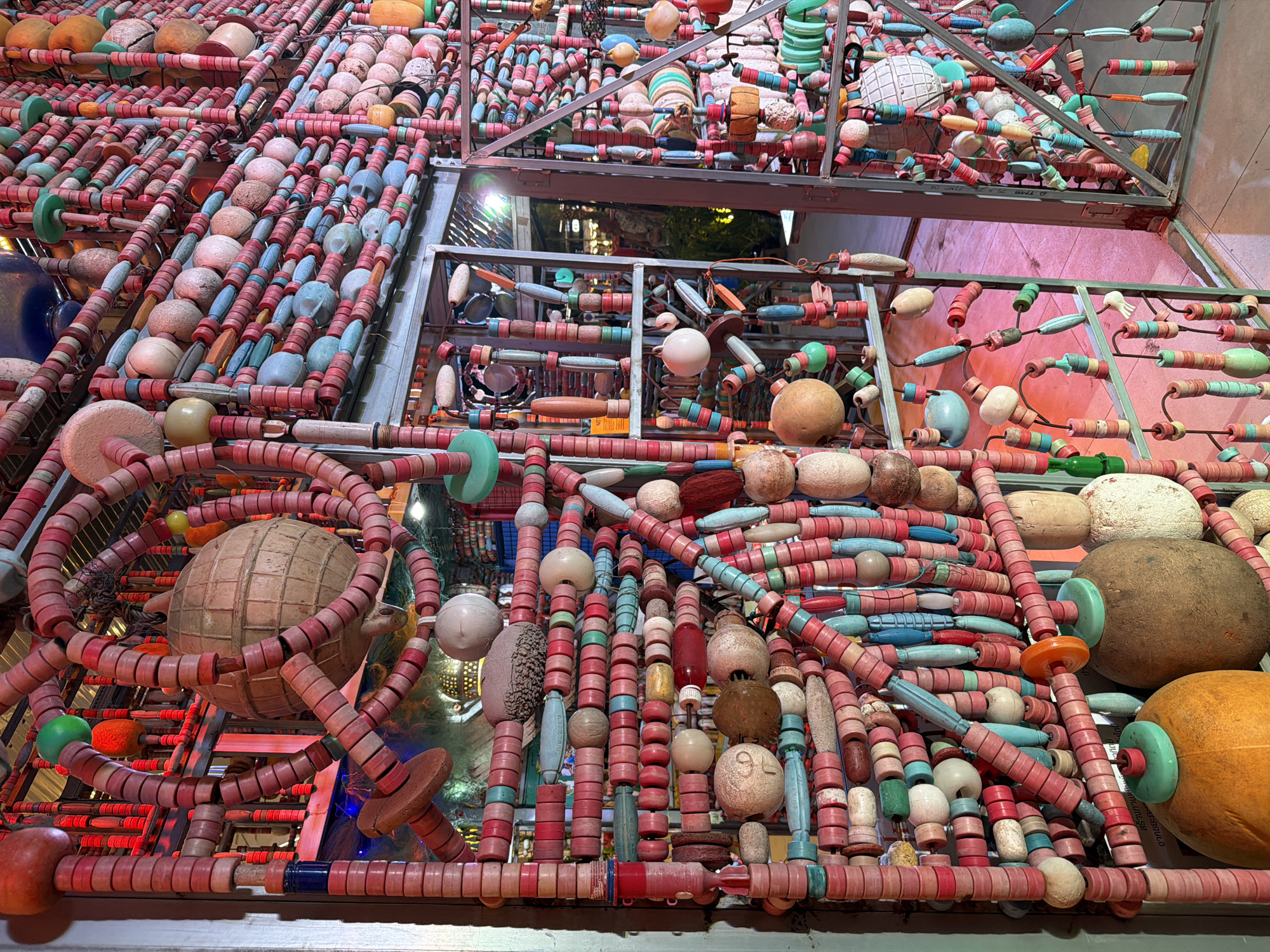 This image depicts a large, vertically oriented decorative wall or partition located in Patong, Thailand. The structure is composed of a dense, grid-like arrangement of numerous salvaged marine objects, predominantly fishing floats and beads, strung onto interconnected vertical and horizontal elements. The primary color scheme consists of faded red, pink, light blue, teal, cream, and white, interspersed with natural wood, green, orange, and dark blue accents. Object shapes include cylinders, spheres, ovoids, and disks, many displaying surface wear and weathering. An illuminated opening, functioning as a passageway, is visible on the right side of the structure, revealing a distant background with blurred artificial lights, green foliage, and architectural outlines. Warm reddish ambient lighting bathes sections of the structure from behind and below. The immediate ground surface is a light-colored, smooth material. No individuals or active interactions are visible in the scene.