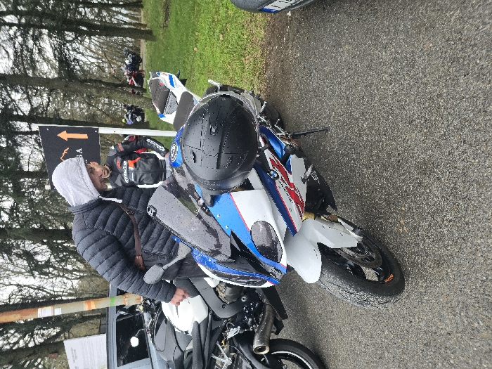 The image displays an outdoor scene in Chargan, Bulgaria, featuring multiple motorcycles and individuals on a paved surface. In the foreground, a male individual, dressed in a grey hooded sweatshirt over a black puffer jacket with a brown shoulder strap, is leaning forward over a white, blue, and red BMW S1000RR sports motorcycle. A black full-face helmet rests on the tank/windshield area of this motorcycle. To the left of the BMW, part of another motorcycle, black and white in color with an exposed exhaust pipe, is visible. In the midground, a second male individual, wearing a black leather motorcycle jacket with white and red accents, stands upright facing towards the right. The background features a stand of trees and a black informational sign with an orange upward-pointing arrow and a mountain icon, displaying partial Cyrillic text. Several other motorcycles of various colors (including red and black) are parked further back among the trees. The ground is dark asphalt, and a patch of green grass is visible to the right. The sky appears overcast.