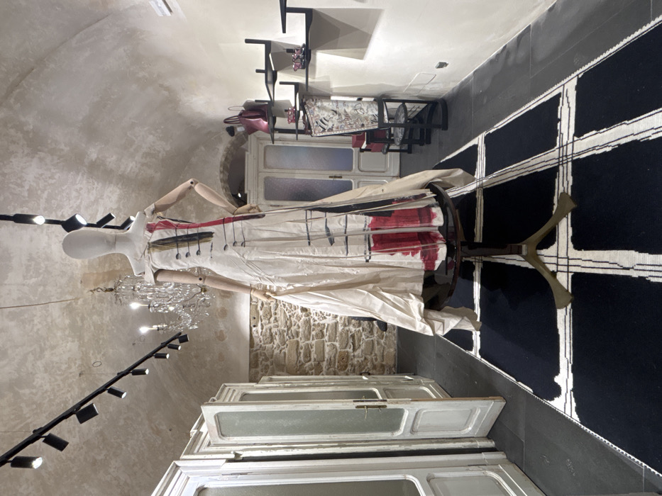 This image depicts an interior scene, likely a boutique or gallery, located in Alghero, Italy. A featureless, light-toned mannequin with articulated wooden arms stands centrally on a dark, circular display table with a brass-colored, four-legged base. The mannequin wears an off-white, floor-length, off-the-shoulder dress adorned with abstract vertical black and red markings, including a substantial red section near the hem. The dress exhibits pleating. The environment features an arched ceiling from which a black track lighting system with multiple spotlights is mounted, along with a prominent crystal chandelier in the mid-background. The left wall displays exposed light-colored stonework, adjacent to a series of white, antique-style wooden doors with glass panels. The right wall is painted a light color and holds several black, minimalist wall-mounted shelves displaying items such as red handbags, pink sandals, and a patterned scarf. A dark chair with patterned upholstery is positioned beneath these shelves. The floor is covered with dark tiles, over which a black rug with a distinctive white grid pattern is laid in the foreground. A pair of white double doors is visible in the background, to the right of the central display.