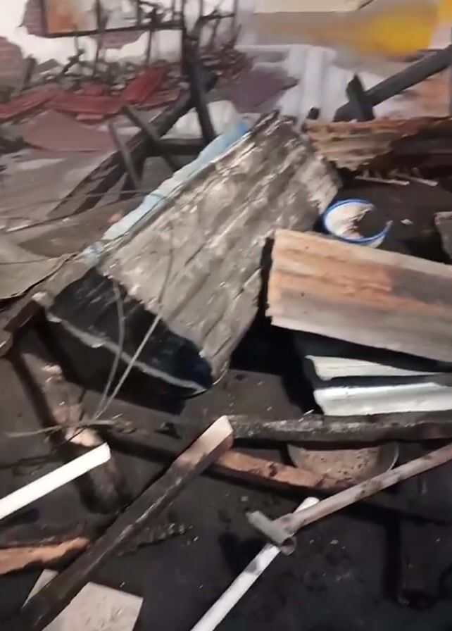 disaster scene created as part of a museum display. The foreground is filled with debris: broken wood, corrugated metal sheets, twisted metal frames, and other unidentified trash. The backdrop is a mural depicting a town devastated by a fire and flood. A sign is visible in the foreground, presumably an informational or warning sign. A person can be seen in the bottom right corner, suggesting that the scene is viewed from a human perspective. The overall impression is a simulated post-disaster environment intended to educate or inform about the effects of natural disasters.
