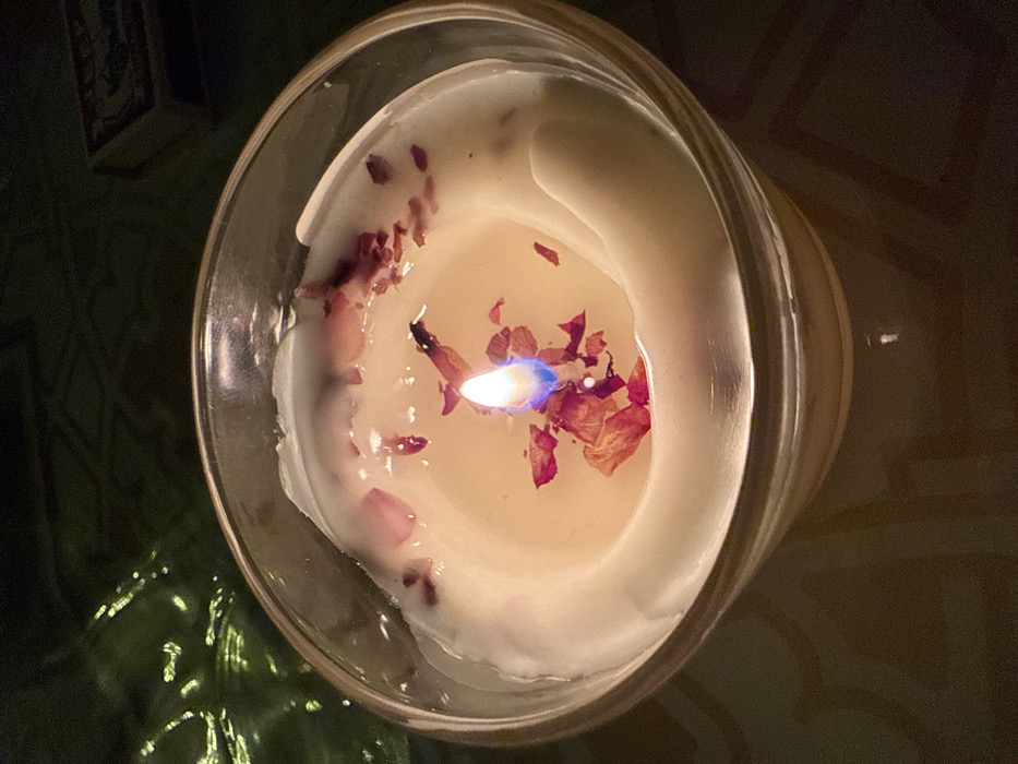 - "A lit candle rests inside a clear glass container, revealing the creamy white wax" by FM-7p9nD3, licensed under CC BY 4.0