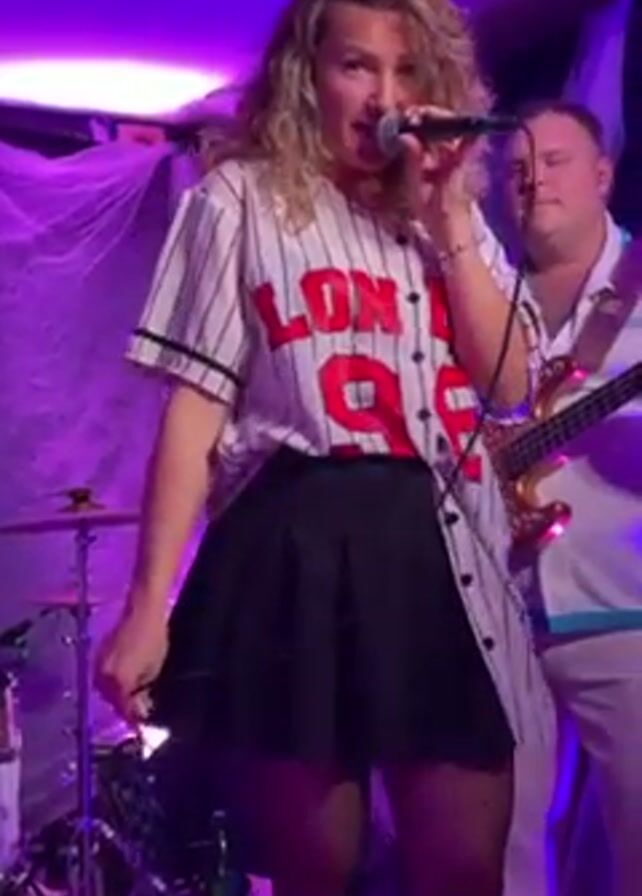 A woman with blonde curly hair, wearing a baseball jersey, a black pleated skirt, and tights, sings into a microphone on a stage