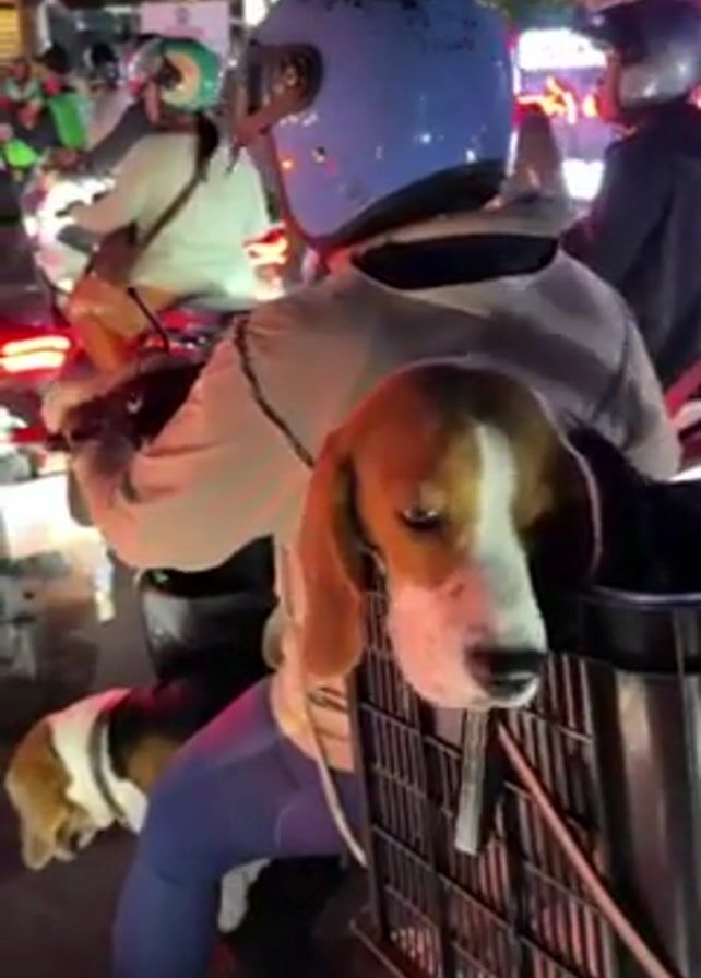 person in a blue helmet on a stopped motorcycle. In front of the motorcycle's seat is a black plastic crate. Inside the crate is a beagle dog, with its head resting on the edge. Another beagle dog is standing on the motorcycle's seat next to the person. The dogs are brown, white, and black. Other motorcycles and people are visible in the background, as well as streetlights and a sign. The scene appears to be at night on a busy street.